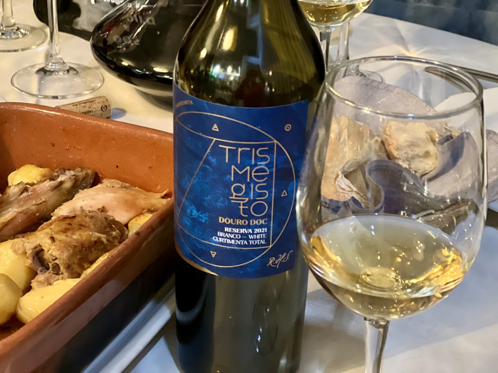 Trismegistro Reserva Branco 2021 e Galo assado servido rico em especiarias, batatas, arroz branco e grelos.